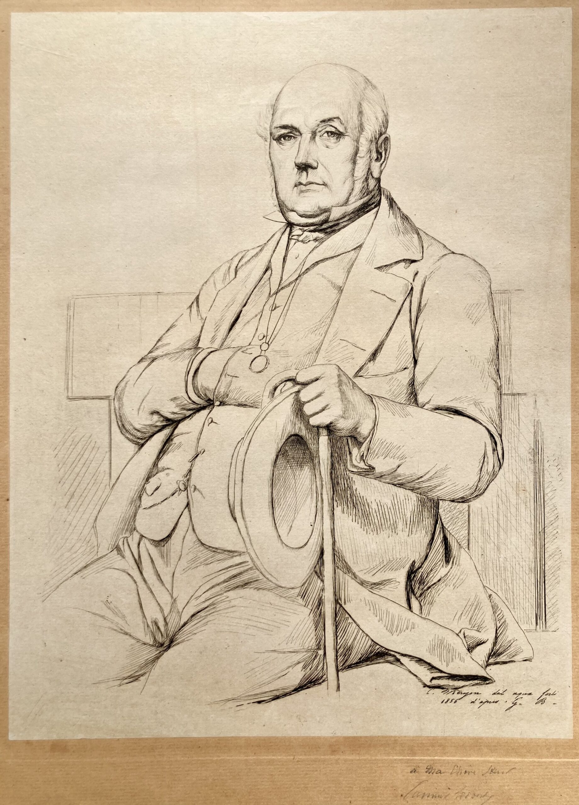 Schneidermann n°63 (II/II). Belle épreuve sur chine appliqué sur vélin, du 2e état (sur 2), dédicacée et signée au crayon par le modèle. Forte oxydation du Vélin; le papier de chine se décolle légèrement par endroits. Belles marges. Le premier état, avant la signature et la date, n’est connu qu’en un exemplaire.