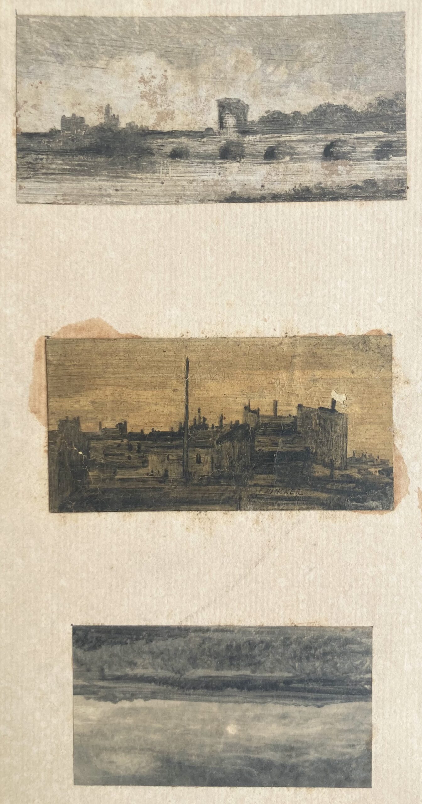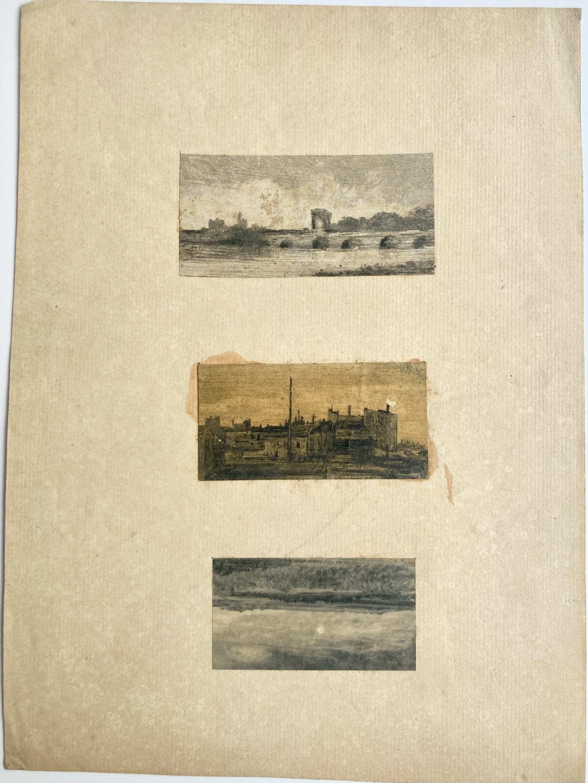 Trois dessins dont un signé en bas au centre, celui du bas peut être sens dessus-dessous. Contrecollés; taches et craquelures.