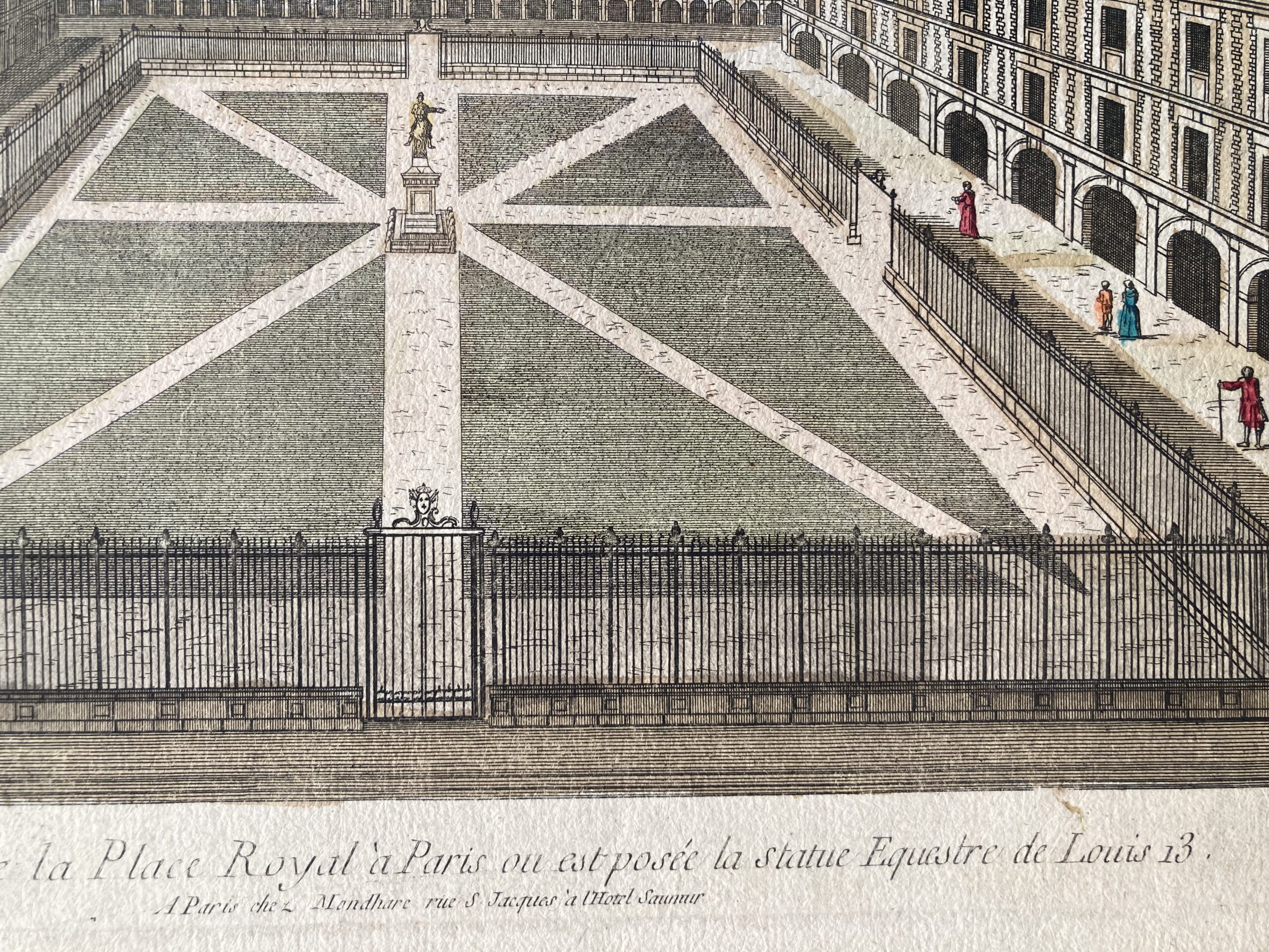 Belle épreuve en coloris d’époque. Quelques rares taches, surtout marginales; légère oxydation. Petites marges. Place royale à Paris devenue place des Vosges.