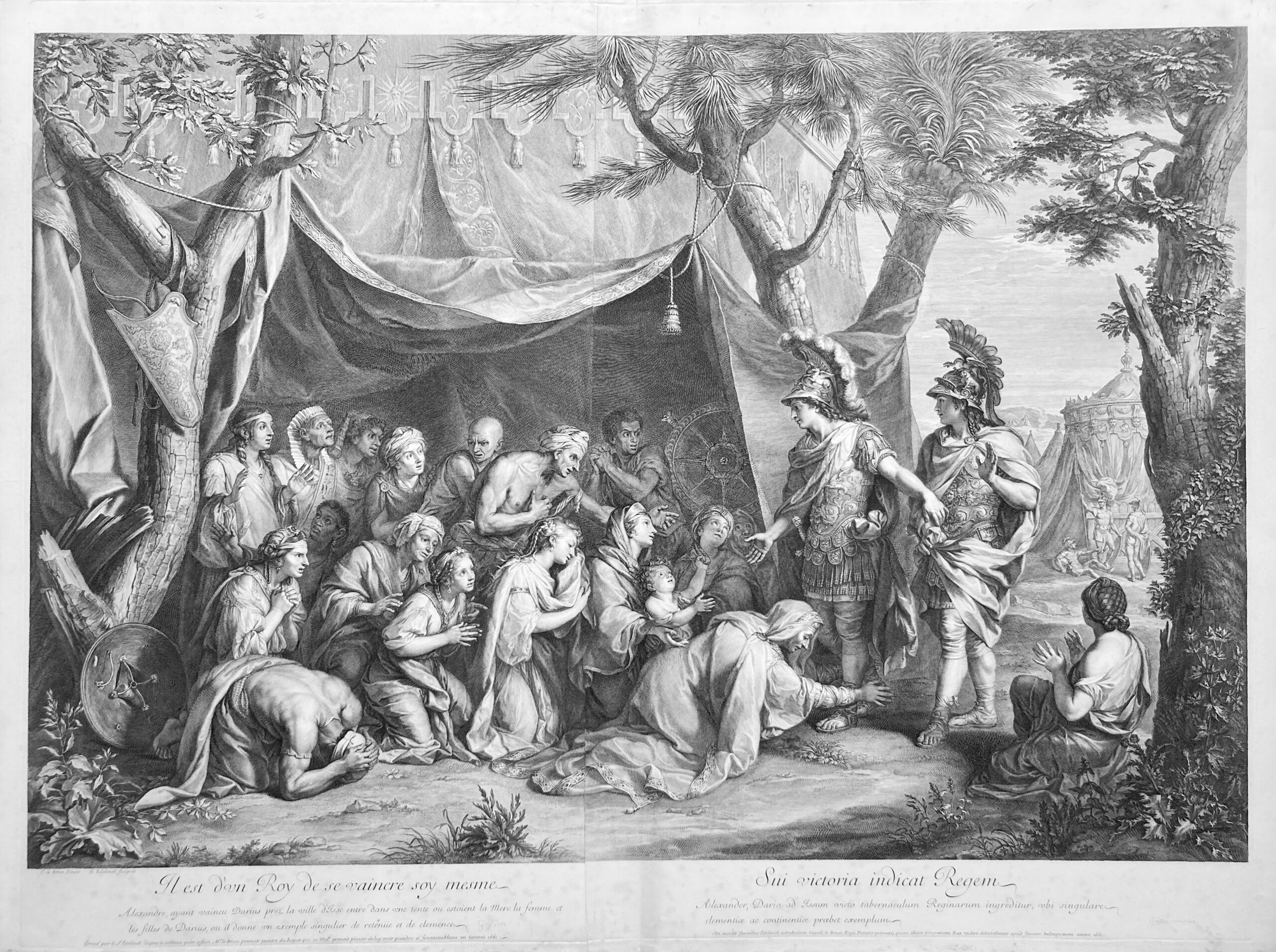 L. Marchesano et C. Michel n°3; Robert-Dumesnil n°42. Très belle épreuve en deux feuilles assemblées. Légères rousseurs, surtout dans la partie inférieure. PLi vertical médian; quelques infimes épidermures et quelques courtes déchirures marginales. Filigrane : nom du papetier HG Cusson (très proche de Gaudraulot pl 127, daté 1672). Girard Audran et Gérard Édelinck traduisirent, entre 1672 et 1678, les grandes toiles peintes par Charles Le Brun illustrant les Batailles d’Alexandre. S’ouvrant par la Famille de Darius, cette suite de cinq monumentales estampes se poursuit par les trois batailles proprement dites (Le Passage du Granique, la Bataille d’Arbelle et Alexandre et Porus) et se clôt par l’Entrée d’Aexandre à Babylone. Nous présentons ici quatre de ces estampes. Le tirage de cette estampe, avec la présence de 9 points à la suite du nom Goyton permet de le situer entre la 899e et la 1000e épreuve imprimée. Au moins 1850 épreuves furent imprimées entre 1675 et 1683. Bien que le tirage en soit important, la qualité en reste remarquable tant au niveau de l’épreuve que de l’état de conservation.