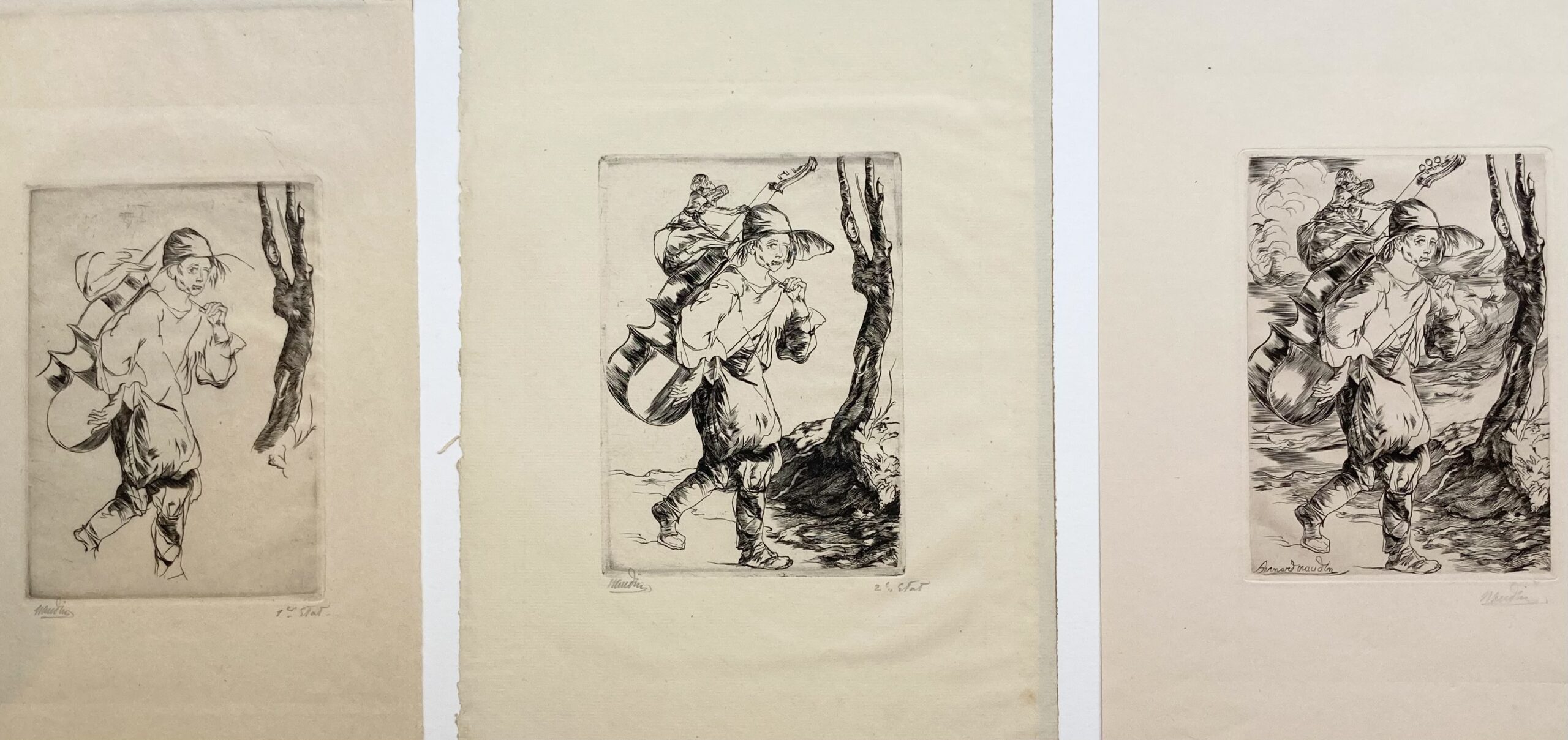 Very good impression on different papers, of 1st, 2nd et 3rd state, signed and annotated. Good margins.