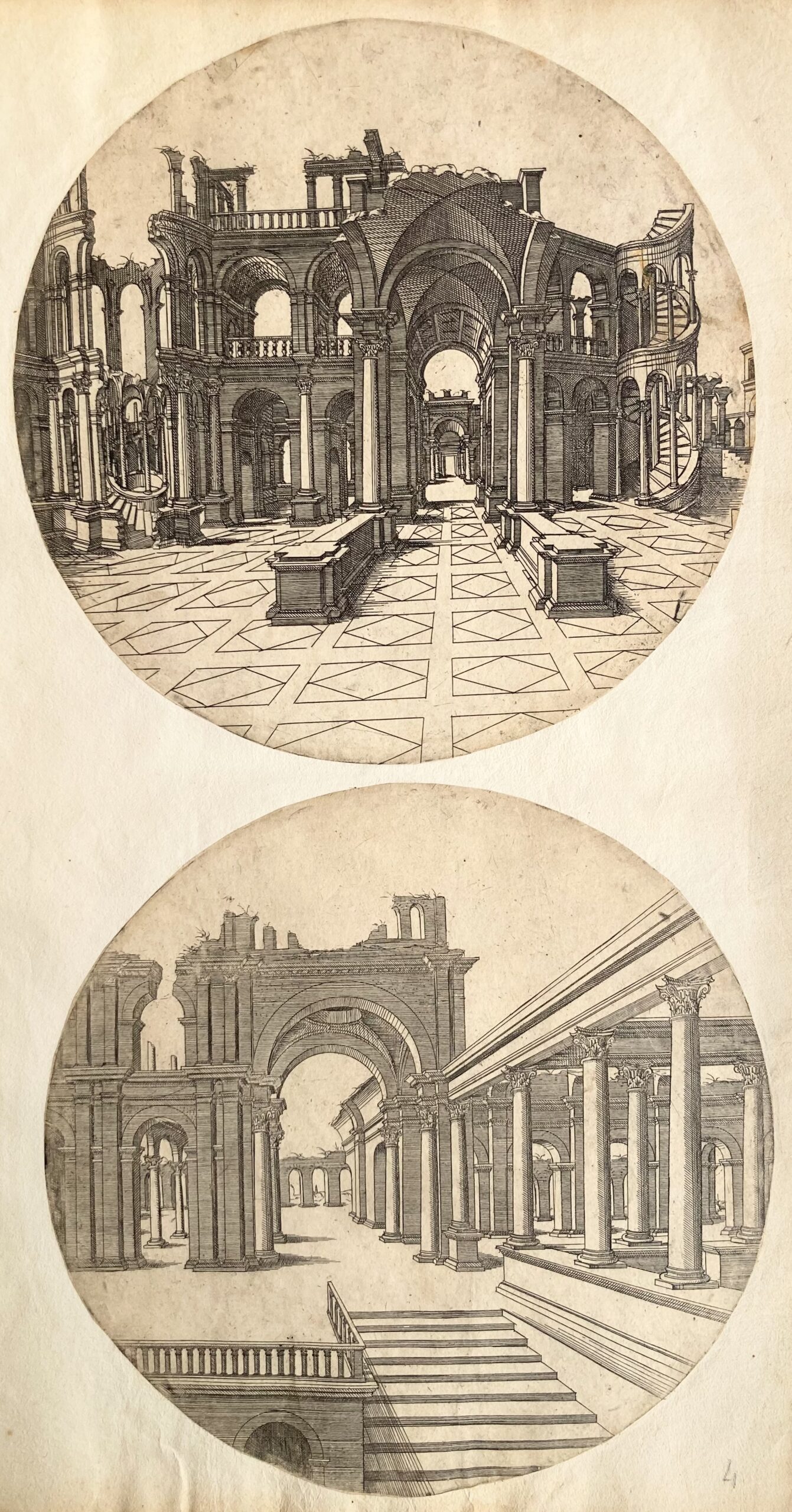 Fuhring p.314. Good circular impressions, after the reduction des cuivres irregularly trimmed at the platemark or into this one (the subject sometimes slightly trimmed in bord), laid down on des feuillets de vergé ancien. Traces de colle (?) sur le pourtour de five or six views whose the title. Some stains. Set of a title, twenty one vues d’optique (VO8 and VO17) each in two versions slightly differents), the church in ruins with the Nativity after le Maître JG and a roman ruin. He his missing to the set VO7. The set included here 24 plates. Edition ca 1560-1580, during the artist’s lifetime (there will be a 3rd edition at the beginning of XVIIth century). Rare.