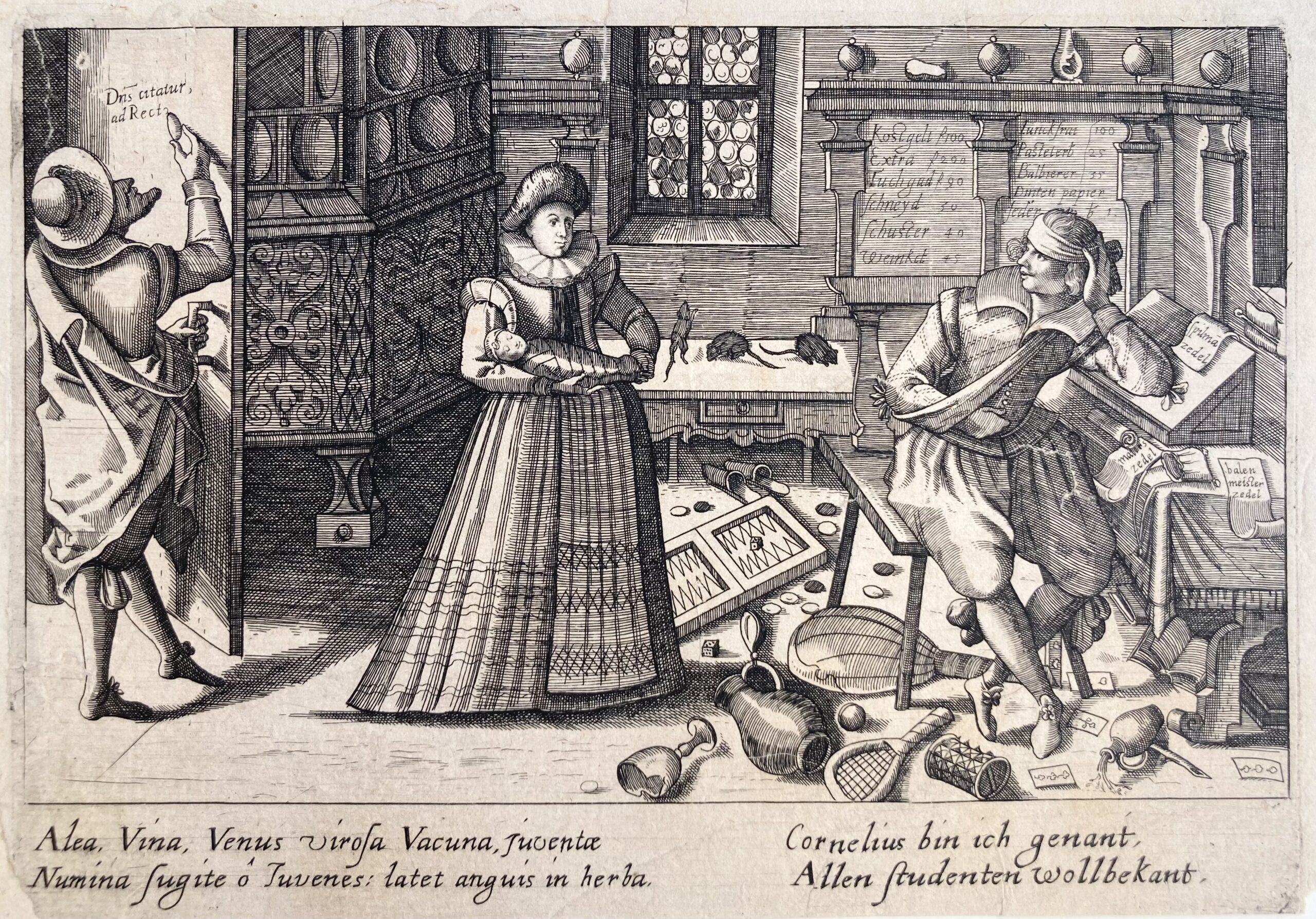 cf Hollstein nr 186. Good impression. Tears restored. Plate for the set “Speculum Cornelianum…” parodying the tumultuous journey of the student “Cornelius”, 1618.