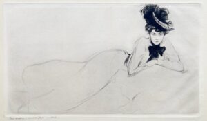 Tabanelli nr 46 (I/II). Very good impression on laid paper of first state (of 2), before the ombrella, the cushion and the pinting, signed and dedicated “à mon ami Sagot”. Rares handling creases and rests of sticky paper at top on the back. Good margins.