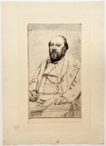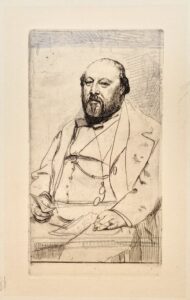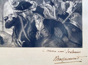Beraldi nr 341 (VIII/IX). Good impression on japan paper, of 8th state (of 9), before the letter, dedicated and signed by pen. Some very rare defects in the subject; some small marginal accidents; foxing on the back.
