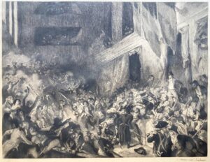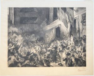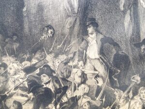 Lieure nr 1353 (II/III). Good impression trimmed at the borderline, of 2nd state (of 3), with Henriet’s address. Small thin paper area at left and in an angle; laid down on old laid paper. Plate to the set “Malheurs et Misères de la Guerre”.
