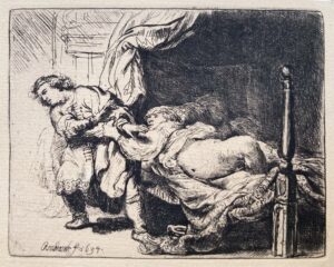 Robert-Dumesnil nr 98 (?/IV); cf Bartsch XV 267.98. Very good impression trimmed at the borderline of an indetermined state (of 4). Glued by the edges on laid paper; two small tears, one in the upper left corner, other in the letter; creases mostly soft and rare other defects.