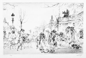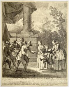 Robert-Dumesnil nr 61 (V/V). Very good impression trimmed at the platemark of the last state. Some slight creases. Seventh plate to a set for pour the “Roman comique” by Scarron of which only part was engraved by the artist.
