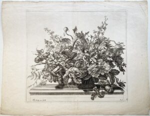 cf. Guilmard p85. Very good impression from a set of “Corbeilles” (?). Creases mostly marginal; a slight diagonal crease in the subject; small stains and dusty mostly marginal. Wide margins. Rare. Watermark : coat of arms of Le Tellier, (close to Gaudriault nr 132), ca 1680 and countermark.