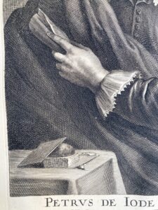 New Hollstein (van Dyck) n°69. Très belle épreuve de l’état définitif. Légère oxydation marginale. Grandes marges. Tirage vers 1720. Pieter de Jode tient dans sa main gauche une feuille de papier et les outils du graveur ainsi qu’une plaque de cuivre sont posés sur la table.