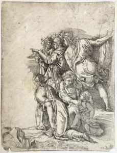 Bartsch illustré n°3 (I/II). Très belle épreuve coupée à la marque du cuivre, du 1er état (sur 2), avant l’adresse de Mariette. Quelques petites rousseurs et très légères taches. Camillo Procaccini n’exécuta que six eaux-fortes. Les traces de polissage du cuivre demeurent très visibles sur notre épreuve.