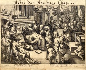 Hollstein (Galle) p123; New Hollstein (Goltzius) D2. Très belle épreuve coupée irrégulièrement au cuivre, du 2e état (sur 3), avant l’ajout du nom de Goltzius. Contrecollée sur une feuille d’album ancien. PLanche de la série des « Actes des Apôtres », autrefois donnée à Hendrick Goltzius.