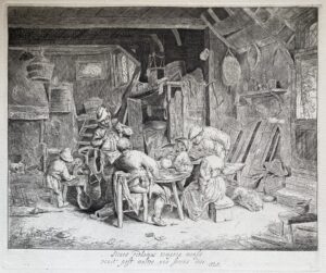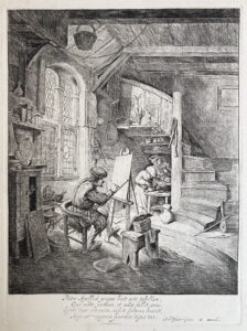 Adriaen van OSTADE – Quatorze eaux-fortes originales. Différents sujets dont “Le peintre dans son atelier”, “La grange”, “Les chanteurs”, “Le paysage au pont”…etc.