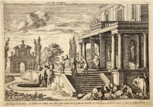 Robert-Dumesnil n°10. Belle épreuve de l’état unique. Petite épidermure en tête à droite; traces de plis notamment médians et petit défaut dans le dos d’un serviteur au centre; légères salissures marginales. Bonnes marges. Rare.