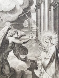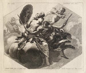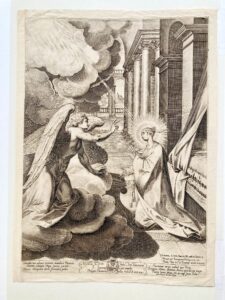 I.F.F. n°140. Très belle épreuve de l’état unique (?). Remargée le long du bord gauche; quelques taches, notamment en pied; quelques traces de plis et une petite tache d’encre (?) sur le bras de l’ange. Petites marges sur trois côtés.