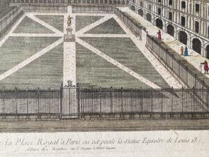 Belle épreuve en coloris d’époque. Quelques rares taches, surtout marginales; légère oxydation. Petites marges. Place royale à Paris devenue place des Vosges.